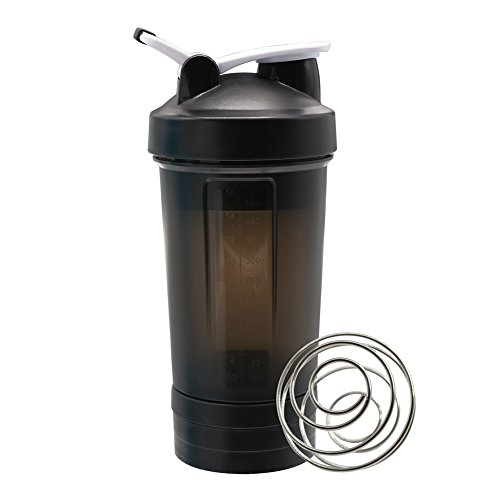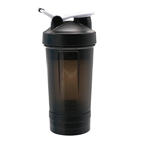 Sport Protein Powder Shaker Bottle, 3-in-1 Free Combination Milkshake Bottle, One Mixer Ball, Two Storage Boxes, Loop Top Design, 17 OZ/500ml, Black, By Auoon