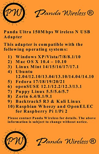 Panda Ultra 150Mbps Wireless N USB Adapter - Windows XP/Vista/7/8/8.1/10, Mac OS X 10.4-10.10, Mint, Ubuntu, Fedora, openSUSE, BackTrack5 R3, Kali Linux and Raspberry Pi 1/Pi 2
