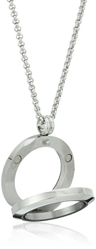 Stainless steel rolo chain necklace featuring open round locket with heart-framed cross