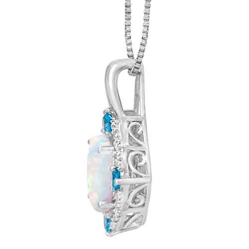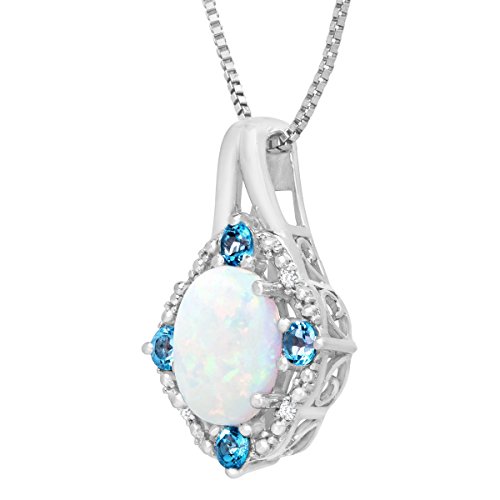 Steal the scene at cocktail hour with this shimmering opal pendant. Finished in a diamond-accented frame of sterling silver, a luminous oval-cut created opal is flanked by round-cut baby Swiss blue topaz totaling 1 1/6 carats. The piece measures 3/4 by 1/2 inches and comes with a sterling silver 18-inch box chain.