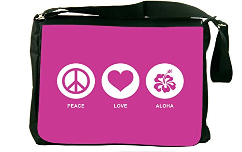 Studio : Rikki Knight LLC Publisher : Rikki Knight LLC Binding : Office Product Product Description Whether from home to the office, on a business trip or to school, the Peace Love Aloha Rose Pink color laptop bag notebook bag messenger bag school bag keeps you comfortable and your cargo safe and sound - this bag features pockets on the outside below the flap for your cellphone, pens, iPod, notebook etc. And also a zippered compartment on the inside, with plenty of space to store your textbooks, folders, files, etc. And up to a 14 inch laptop (laptop sleeve sold separately) - the vibrant image on the front is professionally printed and will not fade or peel with time and this bag will surely be an eye catcher wherever you go with it. Disclaimer: all images are printed directly into the material - the Texture of the image will always be a flat surface. Any images that appears to be 3D, textured, or glittery are flat printed images. 0