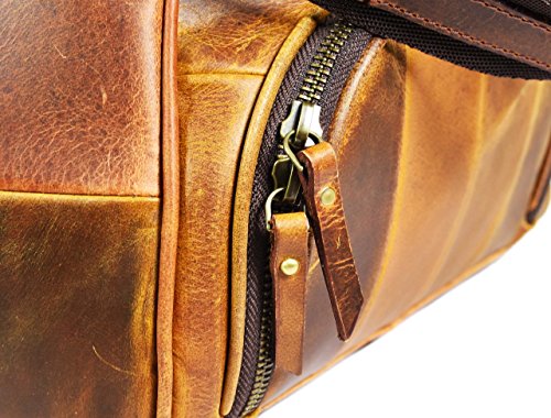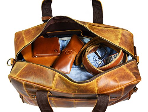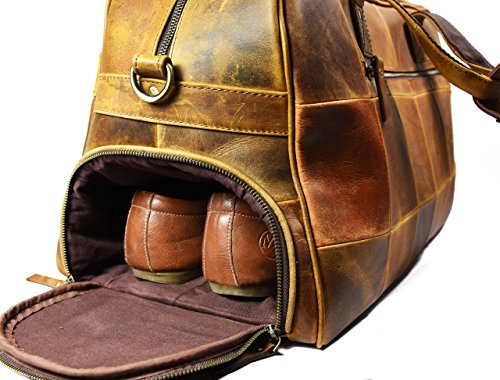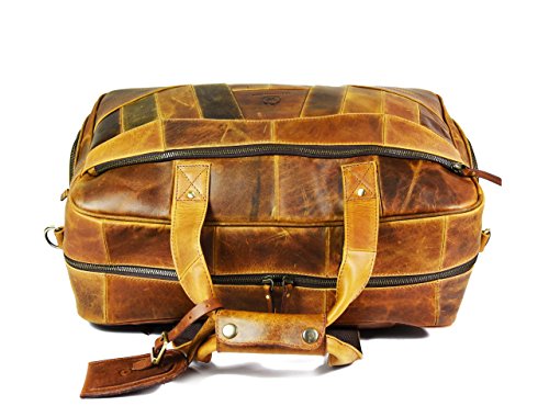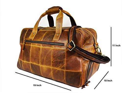 -. Feature : Handcrafted from 100% Genuine Buffalo Leather. / Dimensions in inches: 19(Length), 11(Height), 10(Depth). / Built Strong to Last Long: Stout Brass Fittings, Quality Zippers, Premium Cloth Lining. / All-Round Leather Travel Bag for Weekend Getaways, Air Travels, etc / Attractive Brush-Stroke Design for Enhanced Look Get noticed!