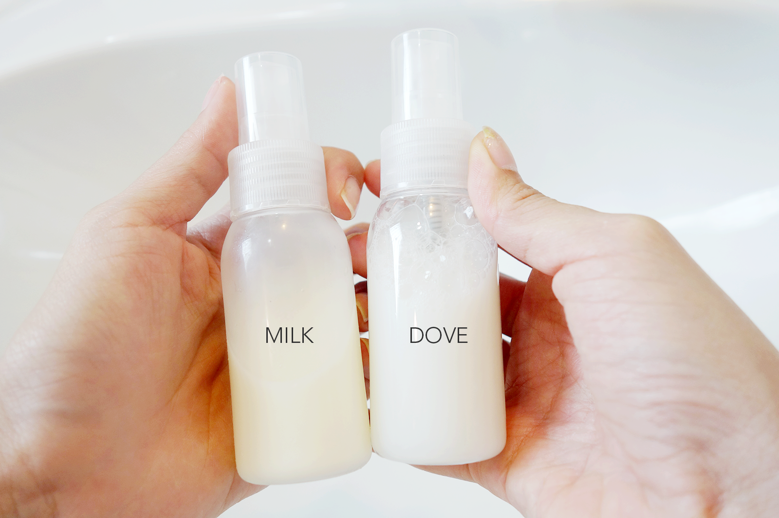 Right, so here in 2 bottles I've got milk and Dove's NutriumMoisture® wash! What I'll be doing is using each of them to spray onto my arms, one for the right and one for the left, and thereafter see which one concluded in a higher hydration level!