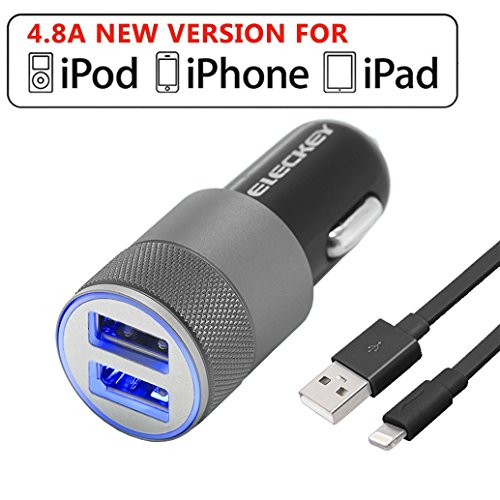 iPhone Car Charger Eleckey-The key to enjoying your electronic device Attractive Design Eleckey car charger with its brushed aluminum finish and circular blue LED light looks as good as it performs.