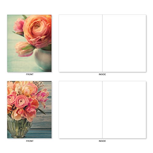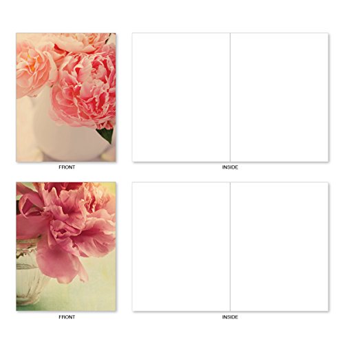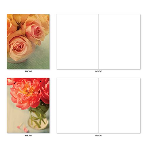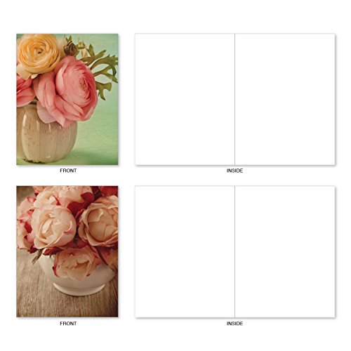M6553OCB Full Blooms: 10 Assorted Blank All-Occasion Note Cards Featuring Nostalgic and Softly Hued Peonies and Roses Set in Varied Vases, w/White Envelopes.