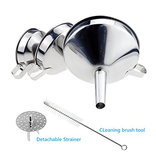Homga Strainer Funnel Set, 3 piece Nested Stainless Steel Funnel set Assorted Sizes With Handle and Detachable Strainer & Cleaning Brush for Transferring of Liquid, Fluid, Dry Ingredients & Powder