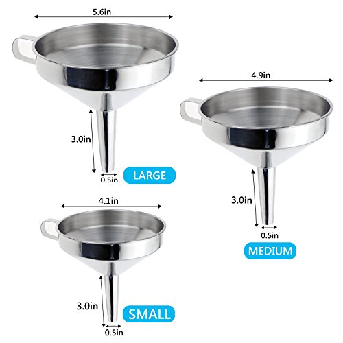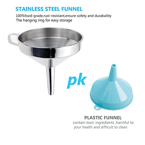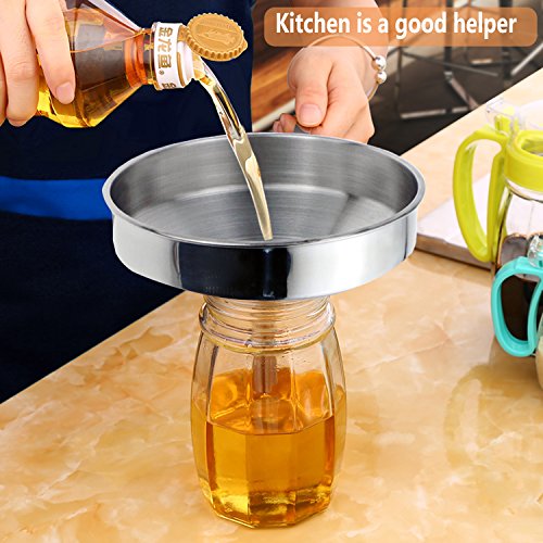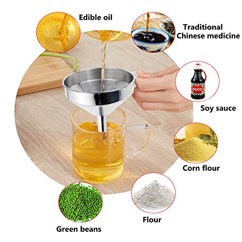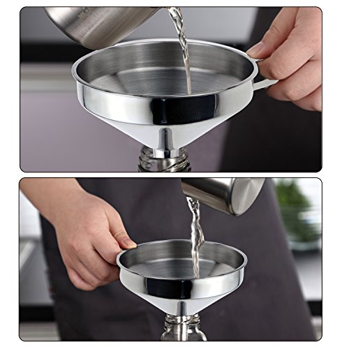 - Durable stainless steel: These filter funnels are made of high quality stainless steel to ensure safety and durability. Better than plastic, they bear the color and smell of some ingredients. The ergonomic handle helps to keep the funnel in jars and bottles more easily.