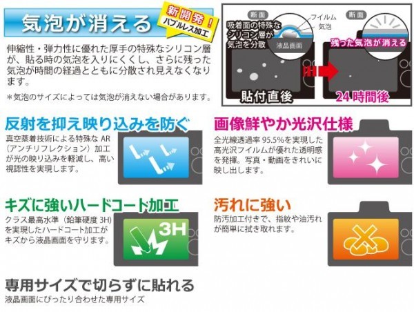 伸縮性・弾力性に優れた特殊なシリコン吸着層が気泡を入りにくくし、残った気泡も時間と共に分散され見えなくなります。真空蒸着技術による特殊な多層膜を施したAR(アンチリフレクション)コートが高い光反射防止性能と視認性を発揮。さらにクラス最高水準(鉛筆高度3H)を実現したハードコート加工がキズから液晶画面を守ります。また防汚加工でフィルム表面に汚れが付きにくく、指紋や皮脂汚れなども簡単に拭き取れます。 |