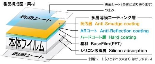 | 伸縮性・弾力性に優れた特殊なシリコン吸着層が気泡を入りにくくし、残った気泡も時間と共に分散され見えなくなります。真空蒸着技術による特殊な多層膜を施したAR(アンチリフレクション)コートが高い光反射防止性能と視認性を発揮。さらにクラス最高水準(鉛筆高度3H)を実現したハードコート加工がキズから液晶画面を守ります。また防汚加工でフィルム表面に汚れが付きにくく、指紋や皮脂汚れなども簡単に拭き取れます。 |