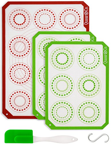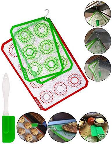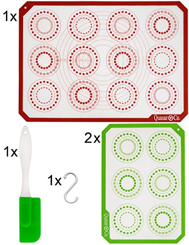 Silicone Baking Mat - Set of 3 | Bundle Silicone Spatulas & Plastic S Hook | 1 Half & 2 Quarter Sheets | Reusable Cooking Mats Silicone | Non-Stick | Heat Resistant Liners | by Quasar&Co