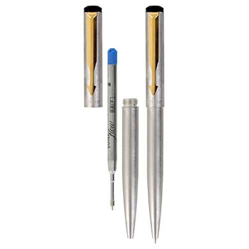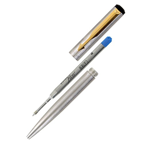 -. Feature : Smooth stainless steel cap and barrel with matching gold plated clip. / Full steel body for extra durability. / Cap action fitted with standard ball point refill. / Blue Ink / Fine Point