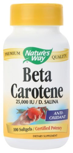 Studio : NATURE'S WAY Publisher : NATURE'S WAY Binding : Health and Beauty Product Description Nature's Way Beta Carotene 100 Softgels. Pack of 7 bottles. Beta Carotene combats free radicals and oxidants that damage cells and DNA. It can also be converted into Vitamin A in the Liver. Ingredients: Vitamin A (100% as beta carotene from Dunaliella salina) 25,000 IU. Other Ingredients: soy oil, gelatin (capsule), olive oil, glycerin, purified water, soy lecithin, annatto seed extract, caramel (color), titanium dioxide (color). Contains soy. 0