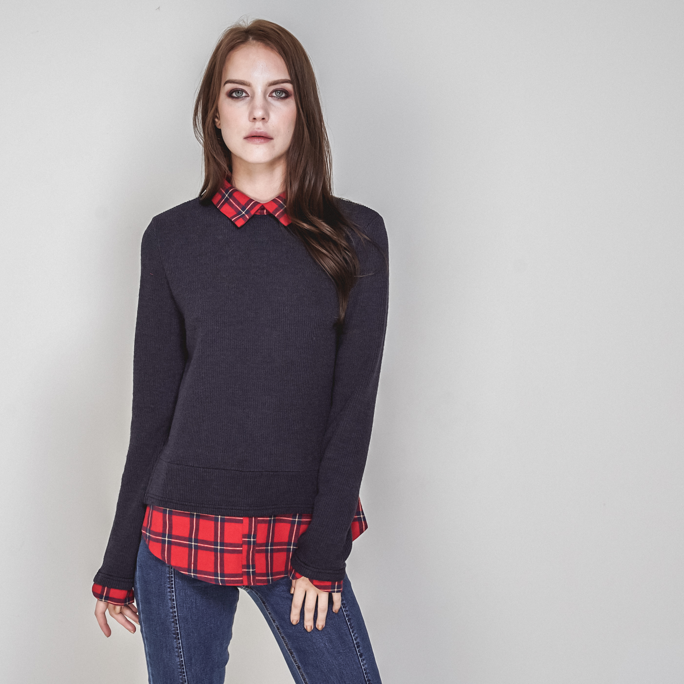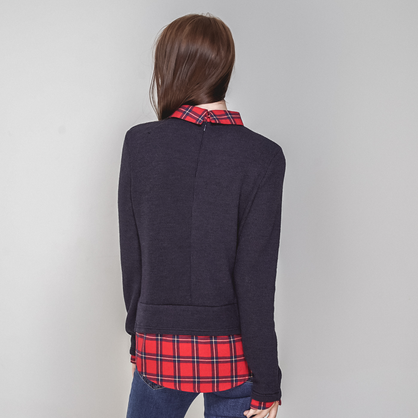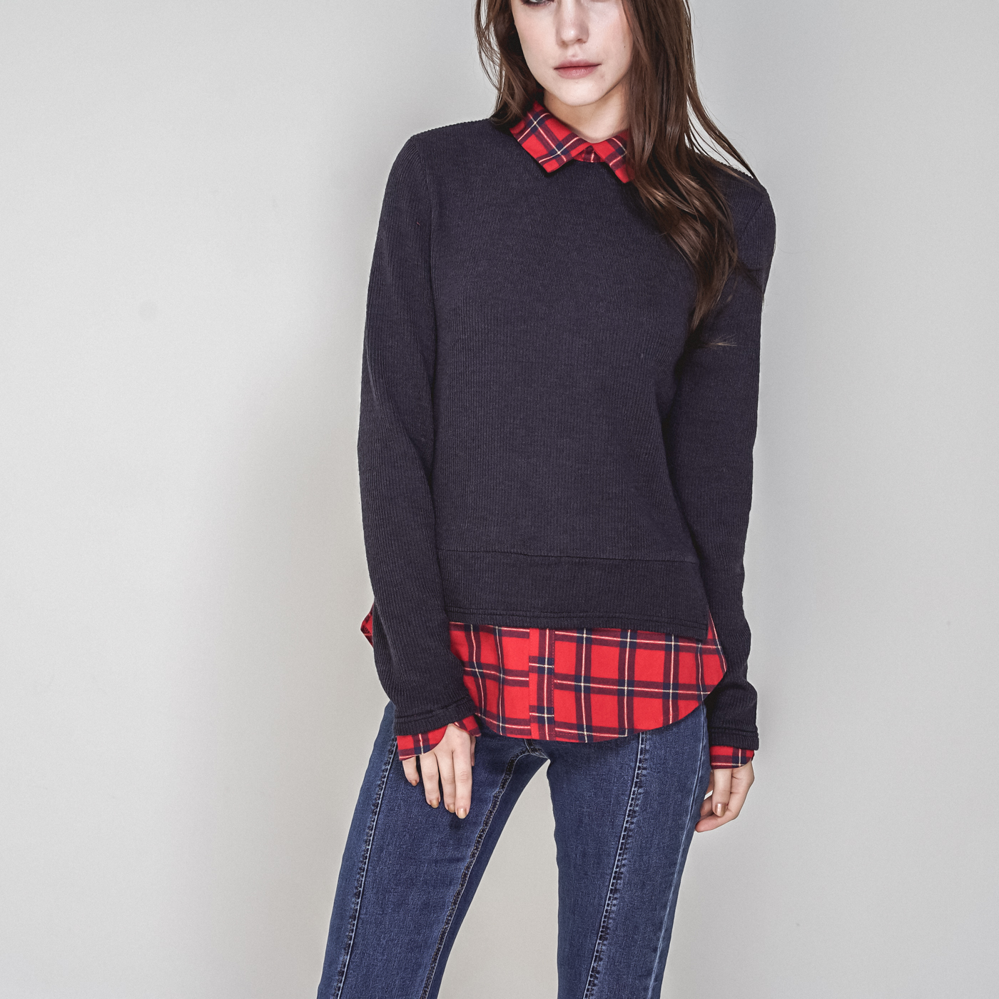 타탄체크와 티셔츠가 레이어드된 일체형 스타일입니다.