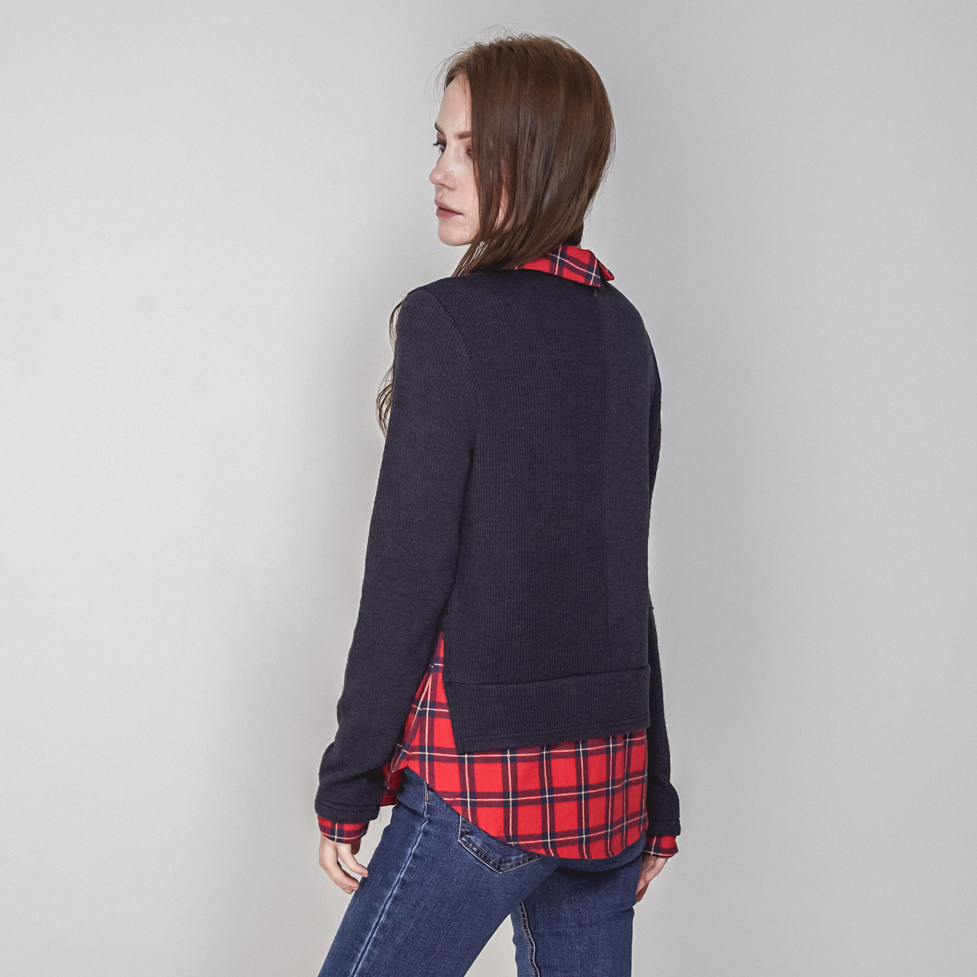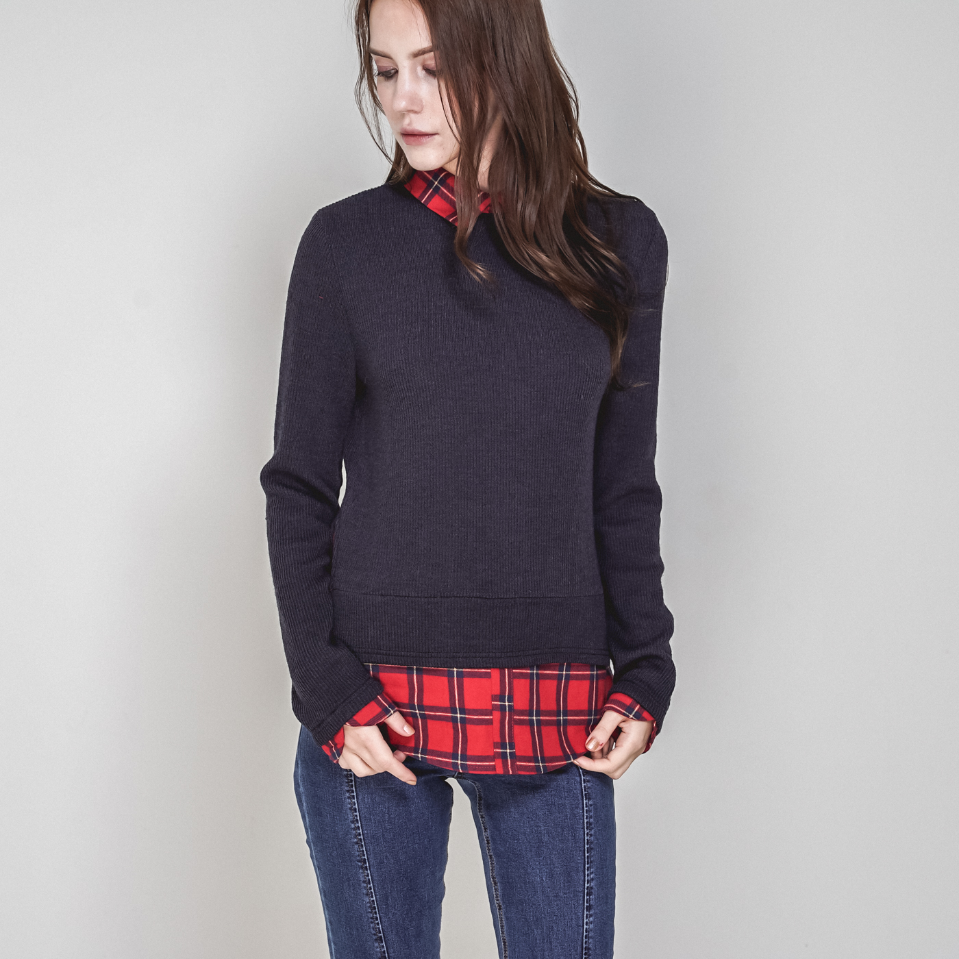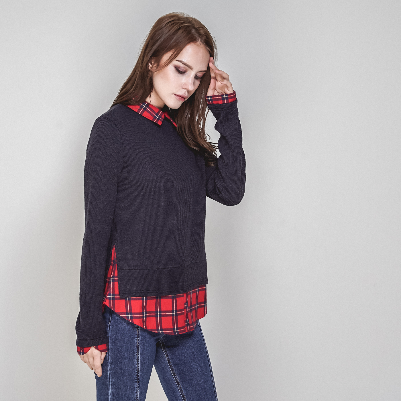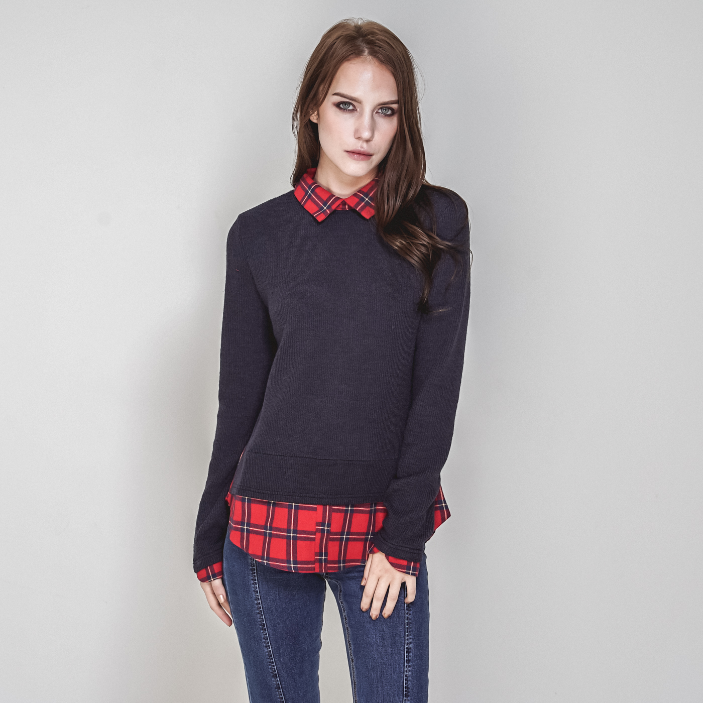 타탄체크와 티셔츠가 레이어드된 일체형 스타일입니다.