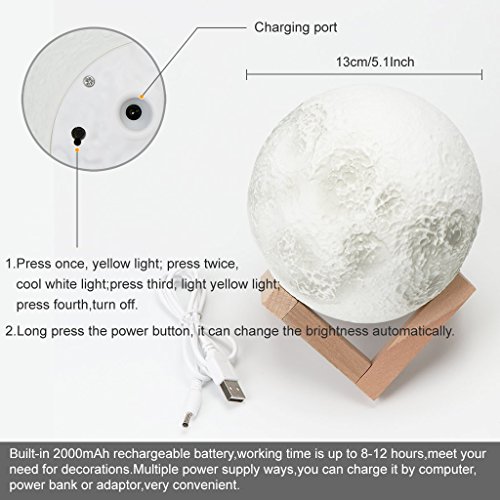 ◆MOON LIGHT USING TIME:The lunar night light's using time is very long,full charge will take about 6 hours,the 3D printing moon night lamp can use 8-12 hours after full charge.