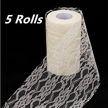 ASIBT 5 Rolls Ivory 6"x 25Yards Vintage Lace Roll Netting Fabric Tulle Roll For Tutu Skirt Table Runner Chair Sash DIY Wedding Party Art Decor (5 Rolls, Ivory)