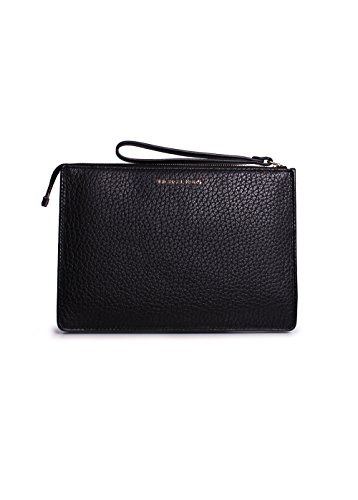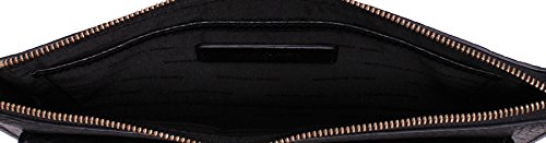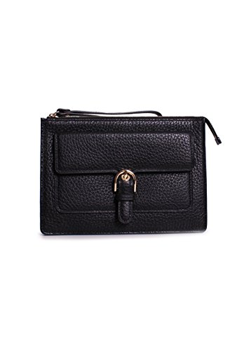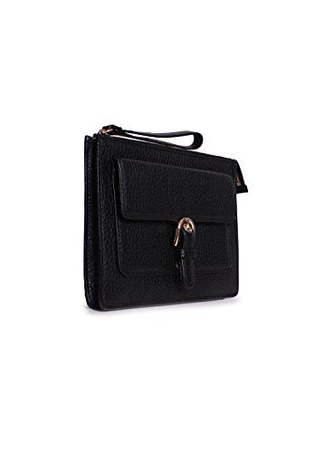 -. Feature : •9" length x 6-1/2" Height x 1/4" Depth / •Interior features 1 slip pocket and 6 card slots / •6"L wrist strap; •Zip closure / •Exterior features shiny gold-tone hardware and 1 front snap pocket / •Black Pebbled Leather outer; lining: polyester