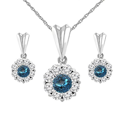 -. Binding : Jewelry -. Brand : Sabrina Silver -. Department : womens -. Feature : 14K Solid Gold / Naturally-vibrant, superior quality color gemstone / High Quality Genuine Diamond Accents / Complimentary gold chain included -. ProductGroup : Jewelry -. ProductTypeName : FASHIONOTHER -. Title : 14K White Gold Natural London Blue Topaz Earrings and Pendant Set with Diamond Halo Round 4 mm