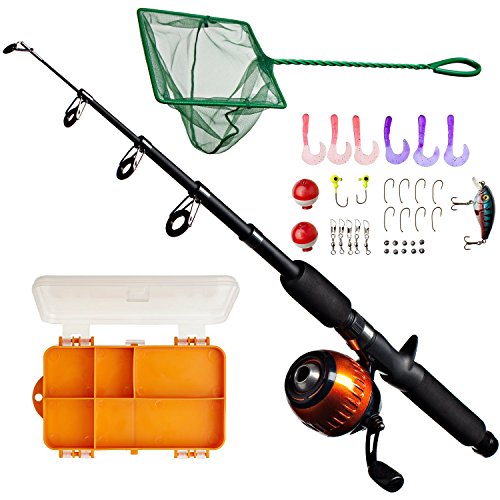 -. Binding : Misc. -. Brand : Lanaak -. EAN : 0865972000409 -. Feature : 47 PIECE SET includes rod and pre-spooled spincast reel; minnow net; tackle box with 42 pieces of tackle; handy 18" x 16" x 3" zipper carry bag to protect your telescopic fishing pole; and beginner's guide to fishing. / FRUSTRATION-FREE button cast reel eliminates the tangles and frustrations of beginner casting. Anglers from 8 to 80 will quickly discover the joy of fishing with this deluxe starter kit. / COMPLETELY OUTFITTED with everything you need to land your first catch. Tackle box includes 2 bobbers; 10 hooks; 10 split sinkers; 10 swivels; 2 jig heads; 6 plastic worms; 1 crankbait; and 1 line clipper. / CATCH YOUR OWN BAIT with our handheld net. Skip the bait shop and watch as your kids happily chase minnows and crickets. Never get bored; never buy bait. This bait net is a secret weapon! / TELESCOPIC FISHING ROD is suitable for kids as well as adults. Fully extended, the pole reaches 78" in length. It collapses to just 17" and stores in its own zipper bag under a car seat or in your backpack. -. IsAutographed : 0 -. IsMemorabilia : 0 -. Label : Lanaak -. Manufacturer : Lanaak -. ProductGroup : Sports -. ProductTypeName : SPORTING_GOODS -. Publisher : Lanaak -. Studio : Lanaak -. Title : Kids Fishing Rod Combo Set with Tackle Box, Minnow Net, Travel Bag and Starter Guide (47 Pieces) -. UPC : 865972000409