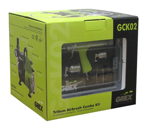 GCK02 - Tritium.TS Airbrush Combo KitEverything Ready in a Box To Go | The Grex GCK02 features the very popular Grex Tritium.TS - and combines everything needed to easily setup a full airbrush system. The Tritium.TS is side fed and is the most premium pistol style trigger airbrush available - one of the most comfortable, easy and intuitive to use airbrushes. Along with the AC1810-A quiet mini compressor and additional accessories, this makes for a very complete kit.Features:- Easy-to-use and comfortable Premium Grex Tritium.TS airbrush- Stylish, quiet, feature-rich and portable Grex AC1810-A airbrush compressor- The G-MACTM gives you precise unrestricted airflow control at your fingertips- Reservoirs included: 7mL and 15mL gravity cups and side Siphon w/ 30mL bottle- 30mL bottle of Private StockTM premium grade, water based acrylic airbrush color- Comprehensive "Getting Started with your Grex Airbrush" DVD- Also includes: 6' Braided Nylon Air Hose, Airbrush Carrying Case