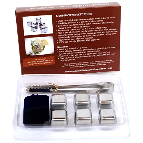 -. Title : Great White Ice Whiskey Stones - 6 Premium Drink Chilling Pure Stainless Steel Reusable Ice Cubes With Tongs And Storage Pouch.