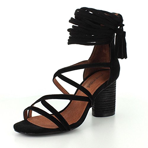 Delicate straps accented with tassels form the ankle cuff on these smooth suede Jeffrey Campbell sandals. Exposed back zip. Stacked, round heel. Leather sole.