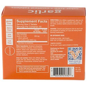 The Vitamin Shoppe® Garlic *Odor Free* ¤ Herb ¤ ? Cardiovascular | Heart ? When raw garlic is crushed, an enzyme acts as an amino acid derivative (alliin) to produce the reactive compound allicin. These coated tablets contain the natural goodness of fresh raw garlic components, including alliin which is enzymatically converted to allicin. They are easy to swallow, tasteless, and best of all they are odor-free. - coated tablet