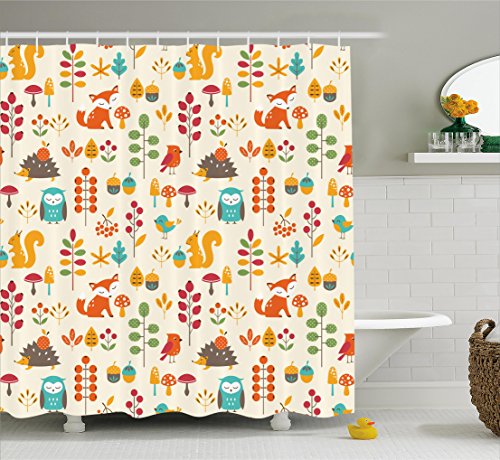 Children Shower Curtain by Ambesonne, Cute Kids Autumn Pattern with Owl Fox Squirrel Birds Animal Leaves Artsy Print, Fabric Bathroom Decor Set with Hooks, 70 Inches, Multicolor