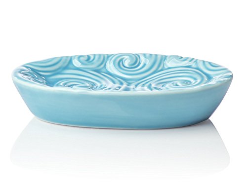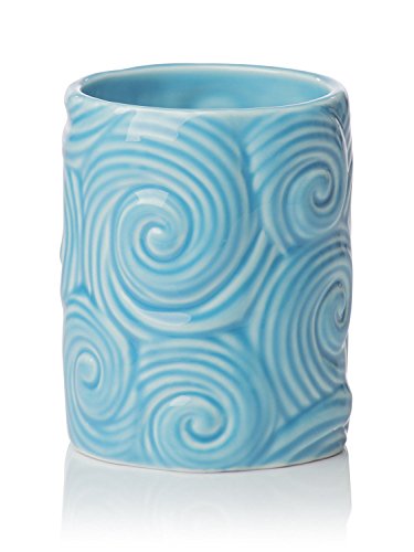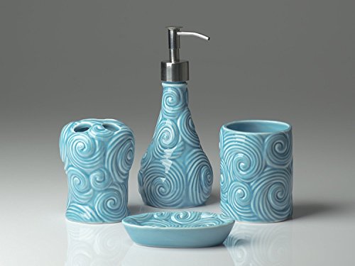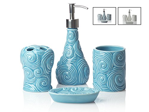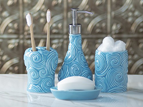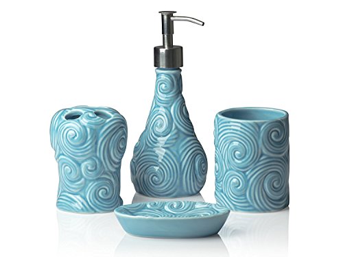 Designer - 4 Piece Bathroom Accessories Set | With Soap or Lotion Dispenser, Toothbrush Holder, Tumbler and Soap Dish | Glossy Finish | Porcelain (Ocean Waves, Aqua Blue)