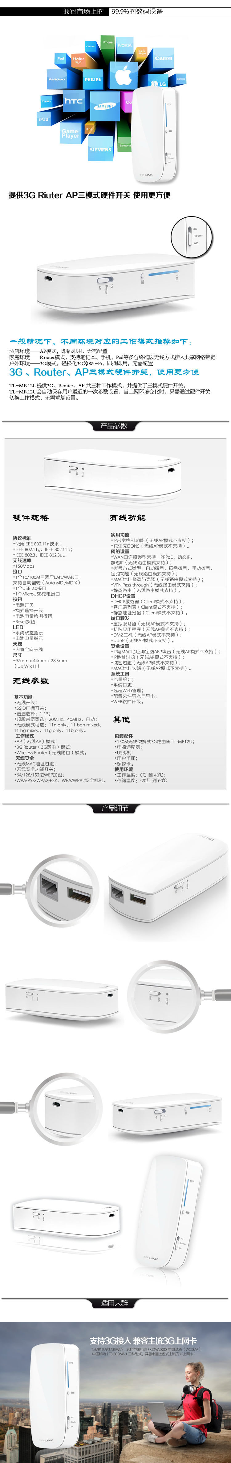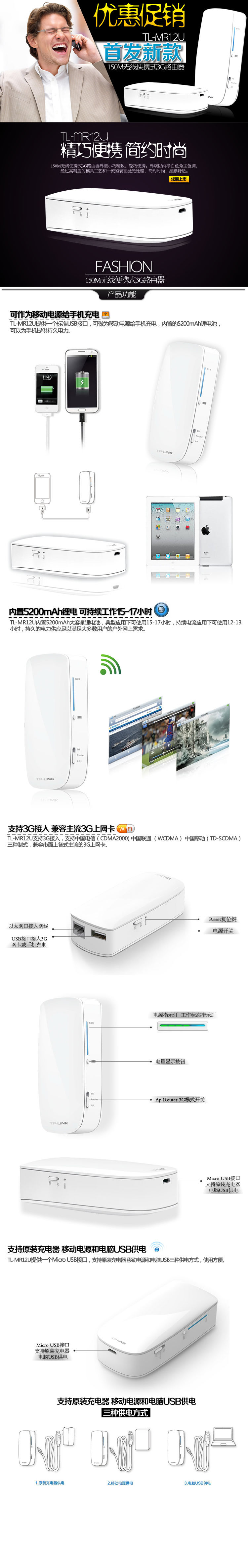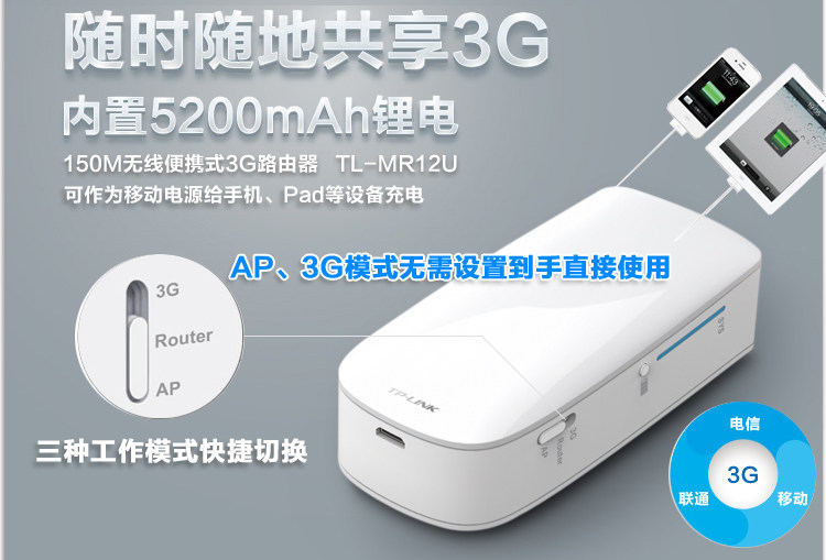 TP-LINK推出全新便携式3G路由器TL-MR12U,兼容中国电信、中国联通、中国移动主流3G上网卡,可以轻松将3G网络转化为Wi-Fi信号,使智能手机、平板电脑,笔记本/上网本等得以通过Wi-Fi共享3G网络。TL-MR12U轻巧纤薄,方便携带;内置5200mA电池,持续模式下可不间断工作15-17个小时,可做为移动电源给手机充电。还提供AP、ROUTER、3G三模式硬件开关,用户可根据上网环境的变化自由切换工作模式,使用更方便。无论在机场,列车,海滩,野外,或是其它任何地方,TL-MR12U可以让用户随时随地畅享3G无线网络。
