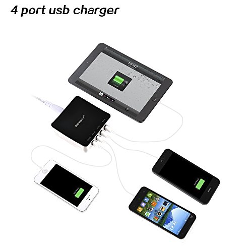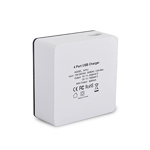 -. Feature : 2.4A ports for Pad(2 ports), 1A port for cell phone(2 ports) totol 6A 31W output. / CONVENIENT: The All-In-One charger,4USB ports,compatible with Apple and Android smartphones,tablet,external battery and other USB-charged Devices. / SAFE: Each product passed high Voltage test (Voltage at 3.2kV), no current leakage, ensure safty while chargering. / SMART: Intelligently identifies your device.Delivers the fastest charge. With over-heated,over-current,over -charging protection Charging will be automatically stop when battery is full / FASTER: Two 2.4A ports for pad,two 1A post for phone,totally 6A,31W output. 2.4A Super Charging Port with intelligent Charging IC in it, Auto Recognize the device and give the Amps needed