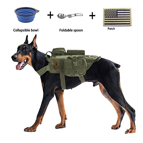 -. Feature : MATERIAL:1000D nylon fabric,waterproof,dry faster;KAM plastic button;AAA high quality. / MOLLE SYSTEM DESIGN:both sides of this dog vest are molle-type design,it can hang all the molle system pouches and equipments,providing your dog with a full range of extension / HANDLES:two carry handles are attached to both the front and back of the harness,providing two attachment points for a leash / PROTECTION: Grid design lining for breathability. Soft pad insert on the collar to prevent chafing on your dog's neck. / BONUS:One collapsible bowl, one foldable spoon & one patch.