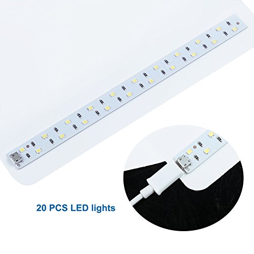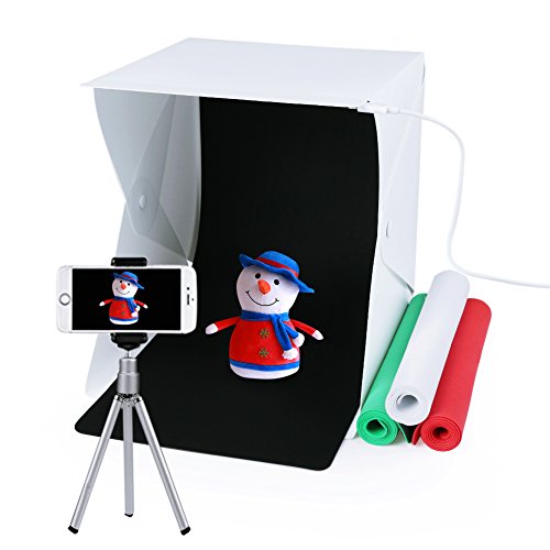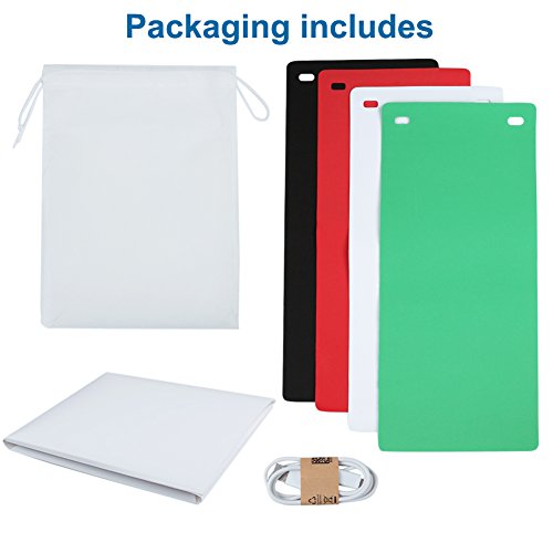 Studio : Huaanlongus Publisher : Huaanlongus Binding : Electronics Product Description Photo Light Box Features: * Snap photos of your gadgets and small gifts anytime and anywhere! * 20pcs bright lED beads provide with uniform light. * Provid white and black backdrop make this shooting tent meets different shooting requirements. * Portable design,easy to store and carry, suits for shooting high quality picture for small products at anyhwere and anytime. * LED light powered via a USB cable. * As the lighting source quantity and variaty were limited due to its size and portability. We recommend you. to used as a temporary studio for its excellent easy-to-use feature and portability. Photo Light Box Specifications: Open product Size 9 x 9.5 x9.5"/ 22 x 24 x24cm Folding product size:9.8" x 9" x 0.39" Photo Light Box Material: Studio(environment plastic)/ background backdrop(EVA) Photo Light Box Package includes: * 1x Photo Studio Box * 1x USB Cable * 1x Black Background Colth * 1x White Background Colth * 1x Red Background Colth * 1x Green Background Colth Warm tip: Please pay attention for the size of the photo studio box. Make sure it can suitable for your products Please noted# you need to connect the USB cable to your own power bank, computor or AC charger to get power. 0