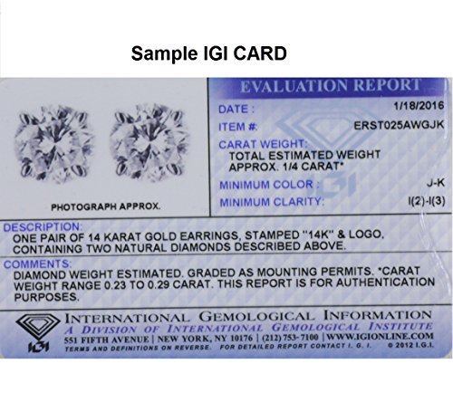 -. Binding : Jewelry -. Brand : Amanda Rose Collection -. Department : womens -. Feature : 1/4ct total weight with IGI Certificate Included. Each earring is tagged by IGI. / 14K white gold Settings and Friction Backs / These diamonds measure approximately 3mm ( just under 1/8 inch) / Earring Box Gift Ready / All of our diamond suppliers and MLG state that to the best or their/our knowledge that all of our diamonds are conflict free. -. Label : Amanda Rose Collection -. Manufacturer : Amanda Rose Collection -. Model : PDE25WG -. MPN : PDE25WG -. PackageQuantity : 1 -. PartNumber : PDE25WG -. ProductGroup : Jewelry -. ProductTypeName : FINEEARRING -. Publisher : Amanda Rose Collection -. Studio : Amanda Rose Collection -. Title : 14K White Gold Round Diamond Stud Earrings 1/4 ct tw. ( IGI Certified)