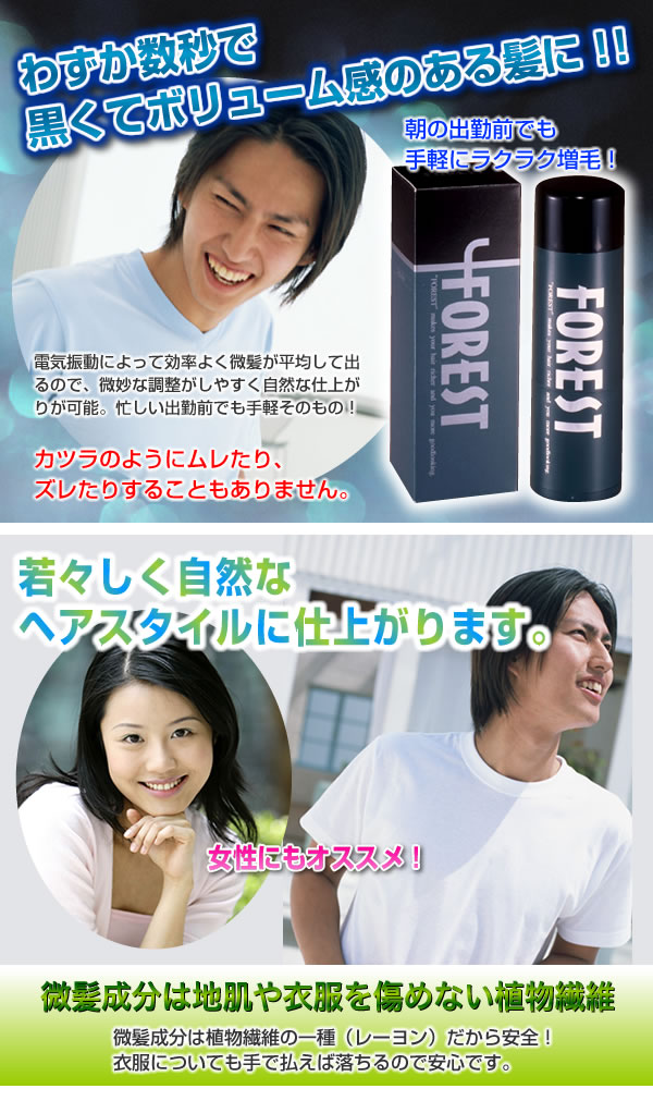 | スイッチONすると毛髪感覚に極めて近い微髪が吹き出し口より霧が降るように噴出、毛髪と静電気と皮脂によりしっかり付着!あなたの髪を太くボリュームアップし薄毛をカバー!!効率よく微髪が平均して出るので、微妙な調整がしやすく自然な仕上がりが可能☆忙しい出勤前でも手軽そのもの!カツラのようにムレたり、ズレたりすることもありません♪ |