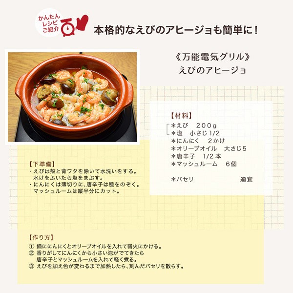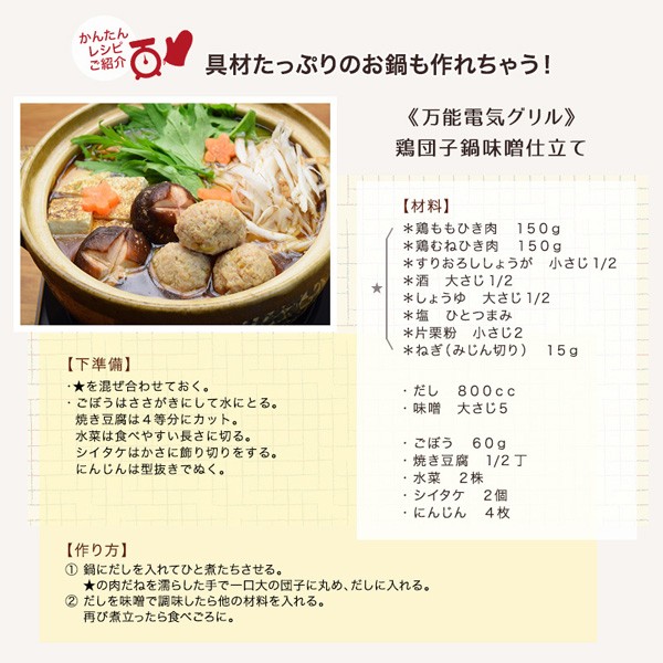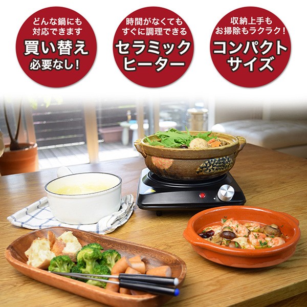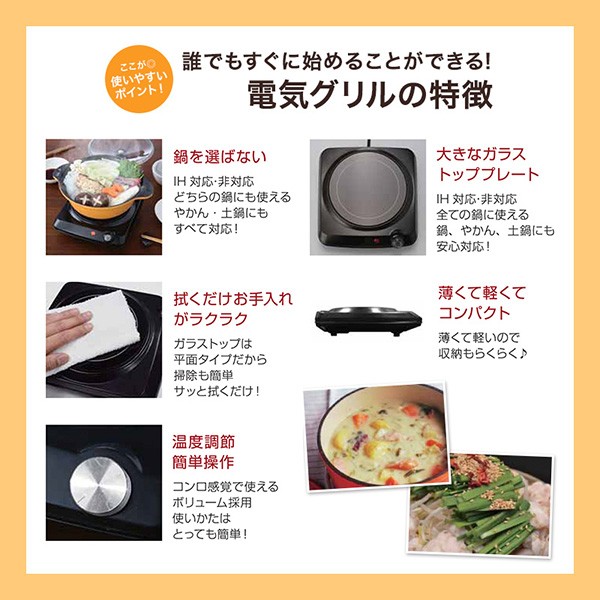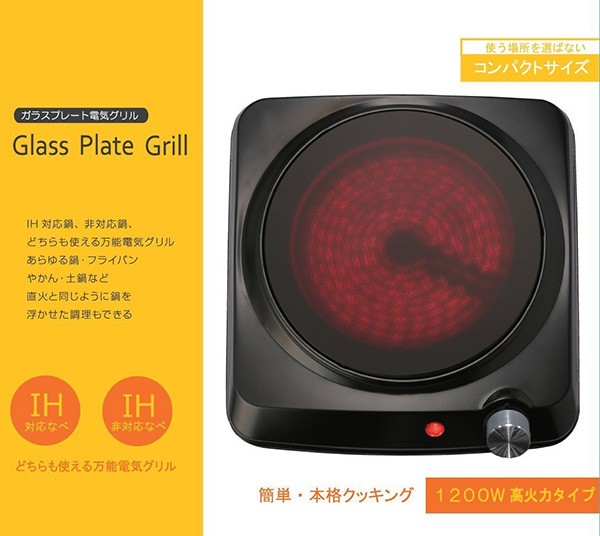 | 商品説明 | 全国送料無料!(沖縄、離島は出荷不可となります) ◆IH対応鍋・非対応鍋・やかん・土鍋にも使える万能電気グリル! ◆時間がなくてもすぐに調理できる「セラミックヒーター」 ◆無段階温度調節ダイヤル(MIN150℃~MAX420℃) ◆ガラストップは平面タイプだから掃除も簡単! ◆薄くて軽いので収納もラクラク! 【仕様】 ・本体サイズ:約幅23×奥行25×高さ9cm ・本体重量:約1.2kg ・電源コード長さ:約1.2m ・プレート:耐熱ガラス(700℃) ・温度ヒューズ:240℃ ・材質:耐熱ガラス、ステンレス、PA |