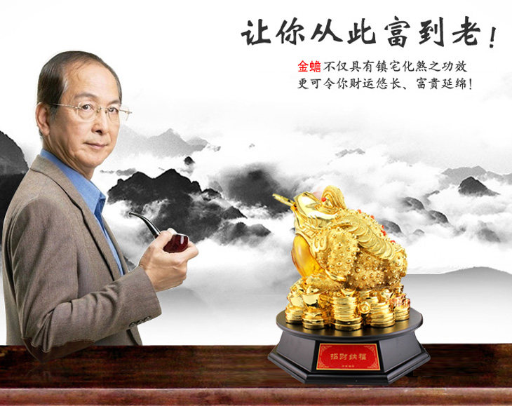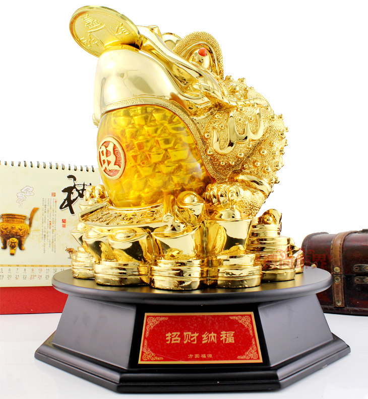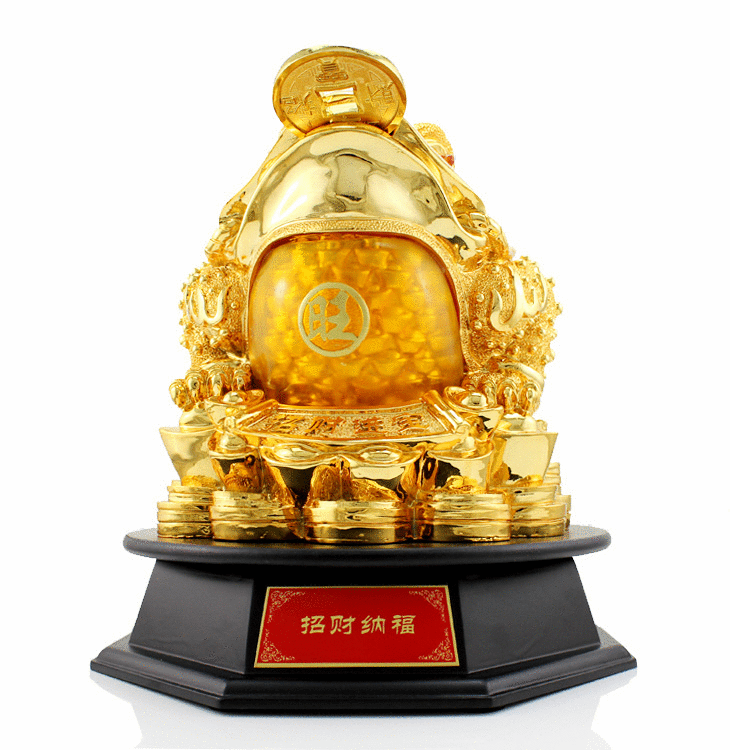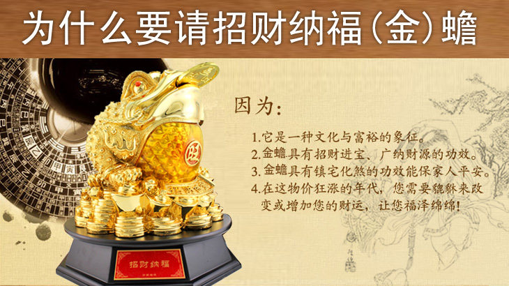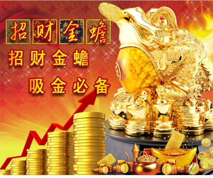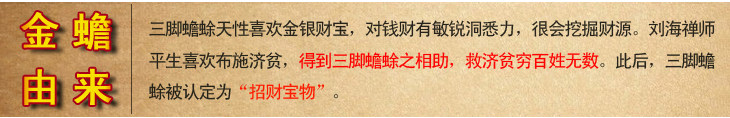 金蟾口吐金钱,是招财吉祥物,三足,背上北斗七星,嘴衔金钱,背负铜钱。三脚金蟾所居之地,都是聚财之宝地,宅内摆放金蟾,有吸财、吐财、聚财、镇财作用,是家居经商旺财运吉祥物