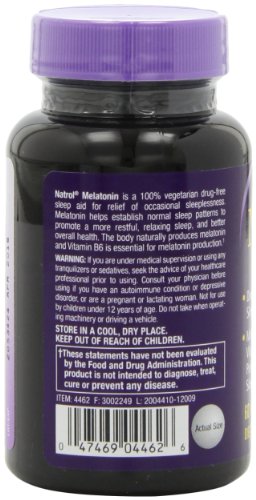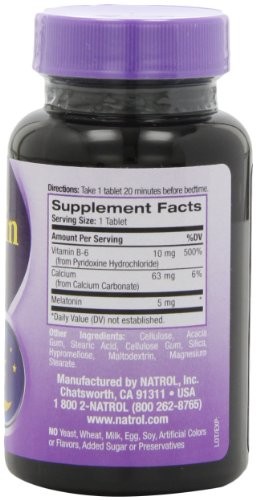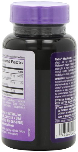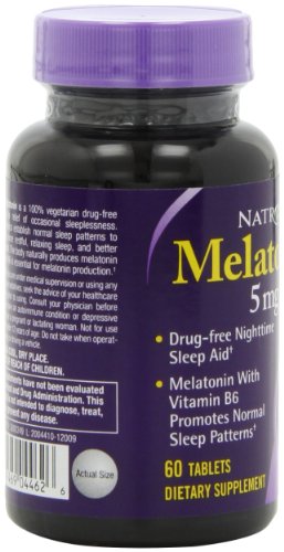 -. Binding : Health and Beauty -. Brand : Natrol -. EAN : 0047469044626 -. Feature : Melatonin provides relief for occasional sleeplessness and helps support rest and relaxation. It does this by helping to establish normal sleep patterns / AdE.q.u.a.t.e sleep is essential to overall health and performance, and plays a role in the ability to learn, solve problems and maintain a healthy mental outlook / Non-habit forming and Drug-Free / 100% Vegetarian and made in the USA -. IsAdultProduct : 0 -. Label : Natrol -. Manufacturer : Natrol -. MPN : 4462 -. NumberOfItems : 3 -. PackageQuantity : 3 -. PartNumber : 4462 -. ProductGroup : Health and Beauty -. ProductTypeName : HEALTH_PERSONAL_CARE -. Publisher : Natrol -. Size : 5 mg -. Studio : Natrol -. Title : Natrol Melatonin Tablets, 5mg, 60 count (pack of 3) -. UPC : 047469044626