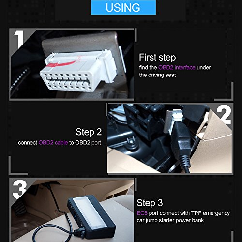 80cm long cable guarantees jump starter stability plus easy access of jump starter connections and power button LED light indicates proper connection to vehicles's ODBII port .