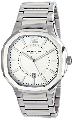 Studio : Akribos XXIV Publisher : Akribos XXIV Binding : Watch Product Description Silver-tone stainless steel case with a stainless steel bracelet. White matte, step with striped etched center dial with silver-tone, luminescent hands and Arabic numeral, baton, silver-tone, luminescent hour markers. Dial Type: Analog. Luminescent hands and hour markers. Date display at 6 oa€TMclock position. Quartz movement. Scratch resistant mineral with sapphire coating crystal. Push/pull crown. Screw-down case back. Case diameter: 46 mm. Case thickness: 12 mm. Octagon case shape. Band width: 25 mm. Band length: 7.5 inches. Fold over with double push button safety clasp. Water resistant at 30 meters / 100 feet. Functions: date, hour, minute, second. Watch label: Hong Kong. Akribos XXIV Silver-tone Stainless Steel Mens Watch AK712SS. 0