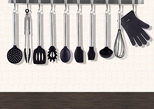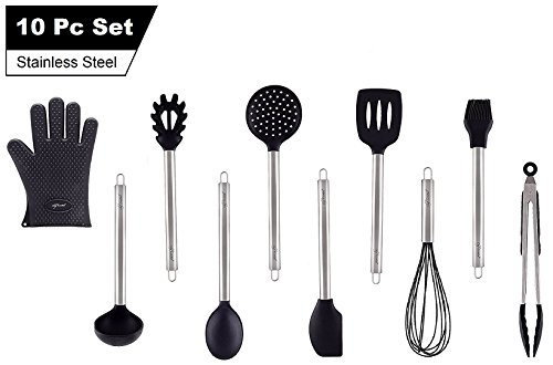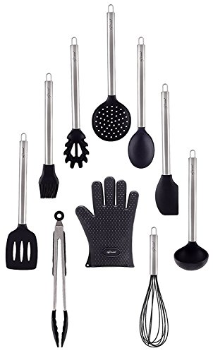 Largest silicone cooking set on Amazon - 10 piece tool and gadget set includes one of each: slotted turner, skimmer, spaghetti server, tongs, whisk, serving spoon, spatula, basting brush, soup ladle, silicone oven glove.