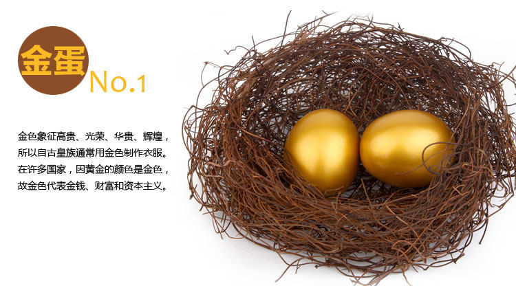 Whether it is the golden egg , or silver eggs , eyes of the world , are a symbol of good luck, happiness, harmony, warm and generous, meaning good wishes . And also with Lucky , the effect of making money . Gold is one of the most brilliant gloss color , it is the supreme nature of solid color , it is the color of the sun , it represents warmth and happiness, but also has a shining earth, radiant charm. Since ancient times, the value of gold to give gold to meet , luxury , decoration, ornate , elegant , sporting , holy , honor and loyalty symbolism. Gold has a very striking effect and Hyun -hui sense . It has a wonderful feature is configured in a variety of colors uncoordinated case , the use of gold will make them instantly harmony together and produce a bright , gorgeous, brilliant visual effects.