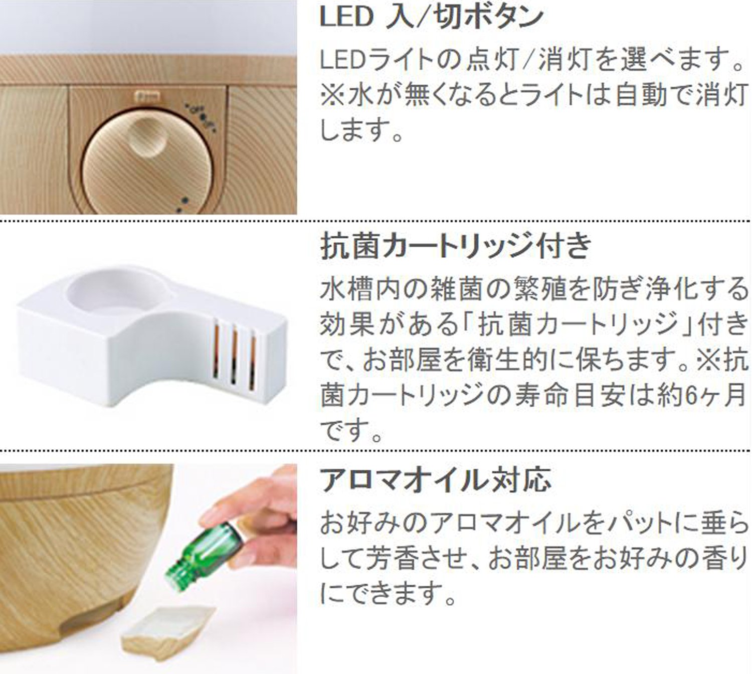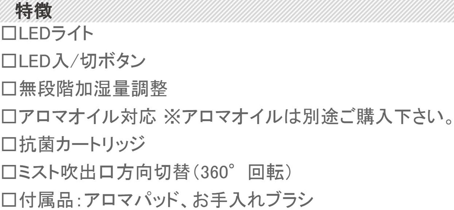You can enjoy your favorite scent while humidifying (※ Note 1) Aroma oil sold separately (※ Note 2) Use aromatic tray without putting aroma oil in water.