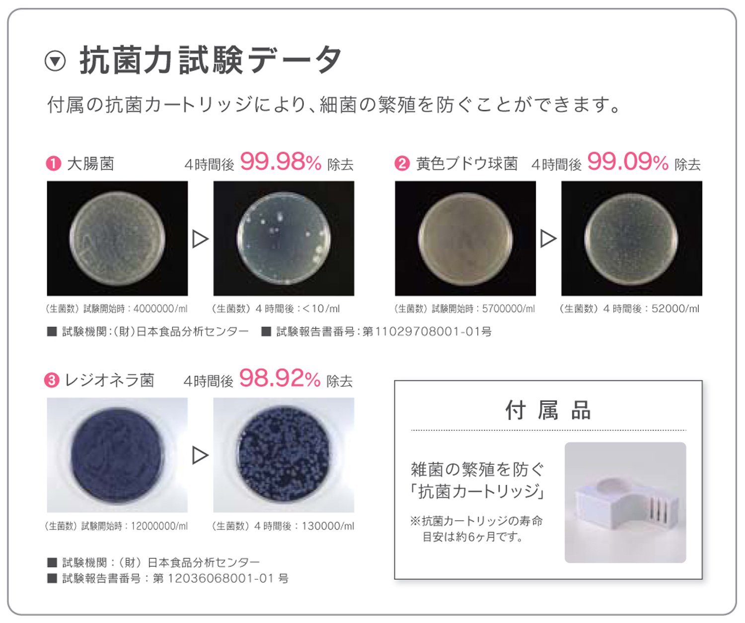 ● Antibacterial cartridge with suppression of bacterial growth.