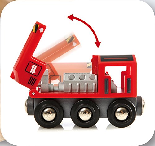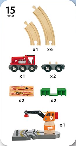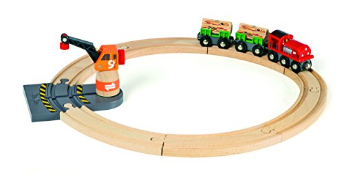 -. Feature : aus Holz und Kunststoff / BRIO Bahn Set mit 15 Teilen / Anlagengröße: 450 x 480 mm / Mit verschiebbarem Kran und einer Schiebelok mit aufklappbarer Motorhaube / 2 Wagen mit Magnetladung und Schienen