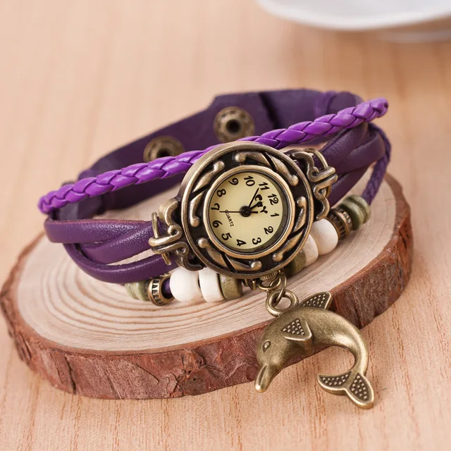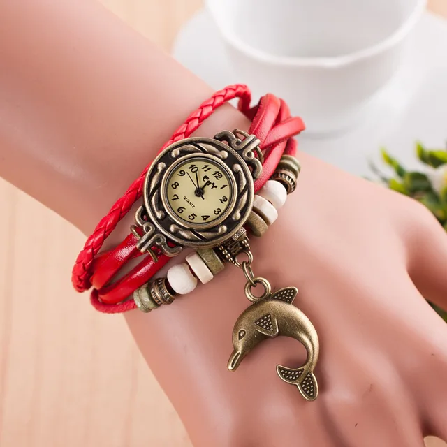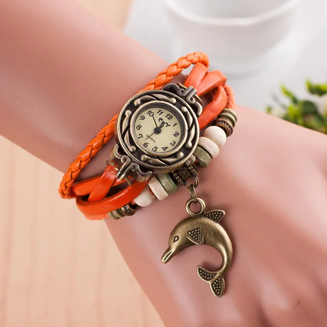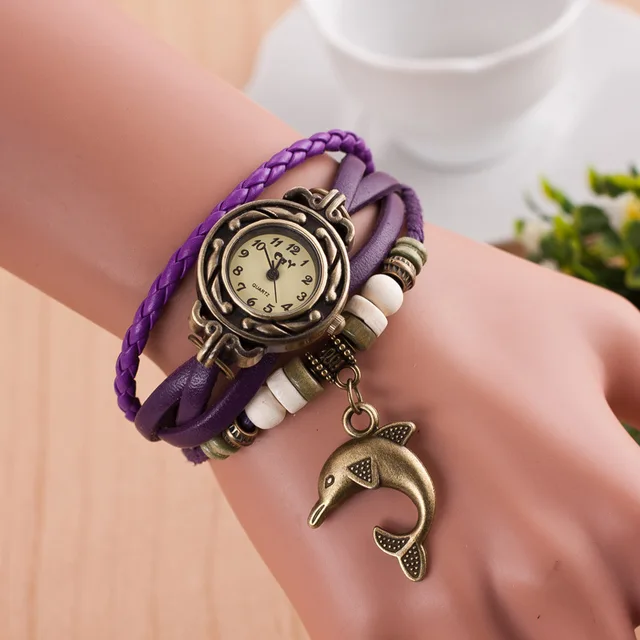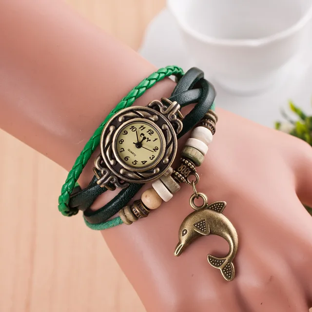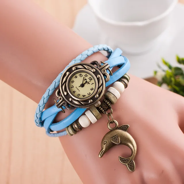 | [해외] 팔찌 팔찌 시계 여성 직조 벨트 센 석영 합금 시계 색상 시계 돌고래 펜던트 reloj dama |