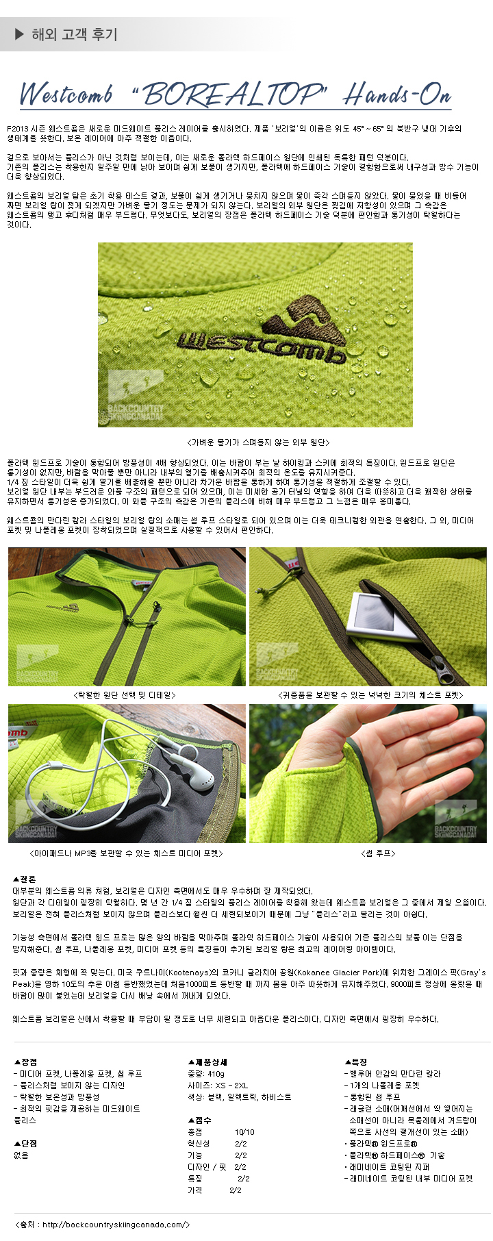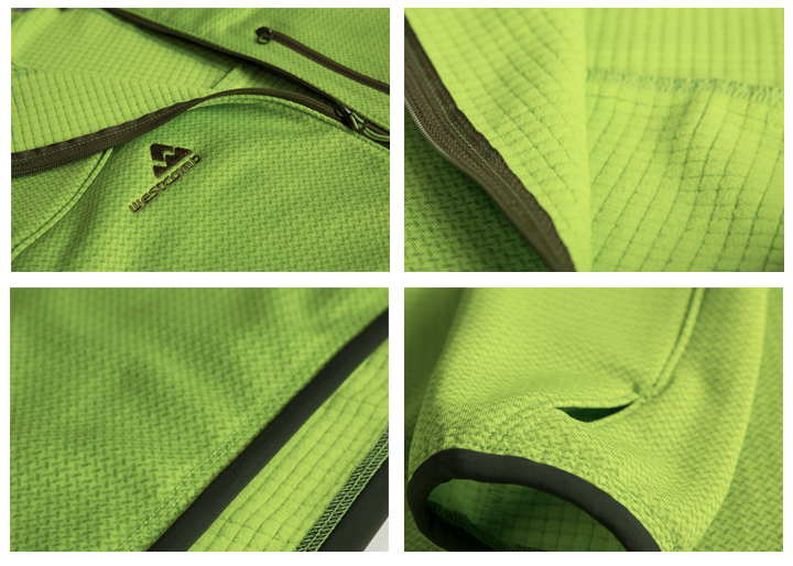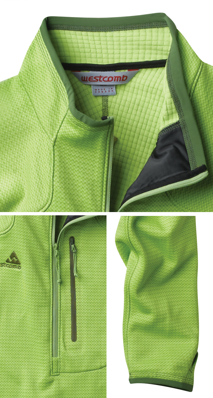 웨스트콤의 가장 가벼운 테크니컬 플리스 레이어로 하프 집 Boreal top의 폴라텍 윈드프로 직물은 기존의 플리스보다 4배의 방풍성을 갖는다. 부드러운 와플트 표면(와플과 같이 표면에 요철감이 있는 부푼감이 있는 것이 특징)의 내부 직조물로 인해 통기성이 더욱 뛰어나며 추운 날씨에 야외활동할 때 따뜻하고 건조하게 유지해준다.