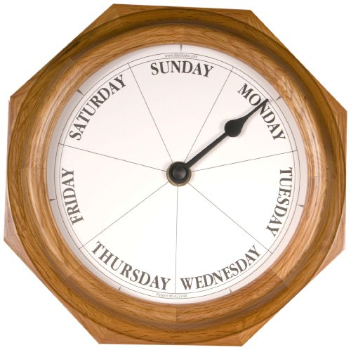 DayClock's patented design divides the face of the clock into seven equal pie-shaped sections, one for each day of the week. Perfect for anyone who is more concerned with knowing what day of the week it is, rather than the exact time. Makes a great gift for retirees or to add a whimsical touch to vacation homes. Great for helping young children learn the days of the week. Also very practical for persons who easily lose track of the days. Classic Mahogany clock fits well in any home decor. Clock face is 7" in diameter. Total size is 9.5 inches high by 9.5 inches wide. DayClocks - Changing the face of time.Feature