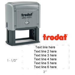 -. Binding : Office Product -. Brand : Trodat -. EAN : 0617724246371 -. Feature : We will message you through Amazon within ONE BUSINESS DAY to request customization. Please keep an eye out in your email AND/OR Amazon messages for this message from us. / Stamp impression area is 1-1/2" x 3". / Customize up to 6 lines of text. / Built to last. Stamps over 1000 impressions before needing to be re-inked. / Self-Inking with the pad inside makes it quick and easy to stamp -. Label : Holmes Stamp & Sign -. Manufacturer : Holmes Stamp & Sign -. MPN : Trodat-4926 -. PackageQuantity : 1 -. PartNumber : Trodat-4926 -. ProductGroup : Office Product -. ProductTypeName : OFFICE_PRODUCTS -. Publisher : Holmes Stamp & Sign -. Studio : Holmes Stamp & Sign -. Title : Trodat 4926 - Large Custom Rubber Stamp -. UPC : 617724246371