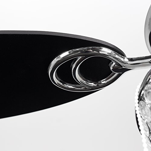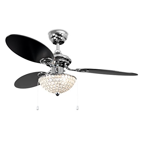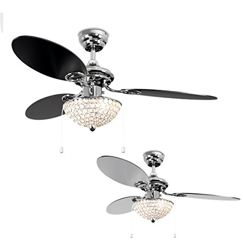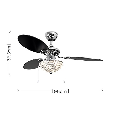 Moderner Deckenventilator in einem glanzigen verchromten Finish mit 3 verkehrbaren Flugeln (silberfarbig/schwarz)- mit transparenten Juwelen aus Acryl auf dem Lampenschirm